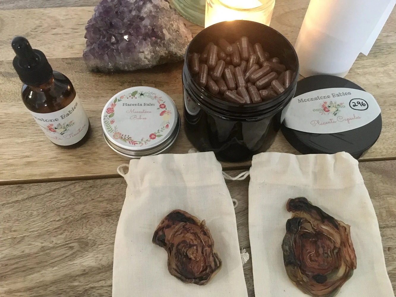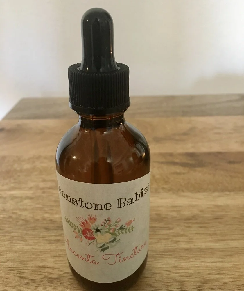 Placenta Tincture – A small piece of placenta is placed within grain alcohol to create a tincture. This tincture can be used when the placenta pills are finished to offer a similar support to the mother. It also becomes more medicinal with age and can help balance hormones during menopause.